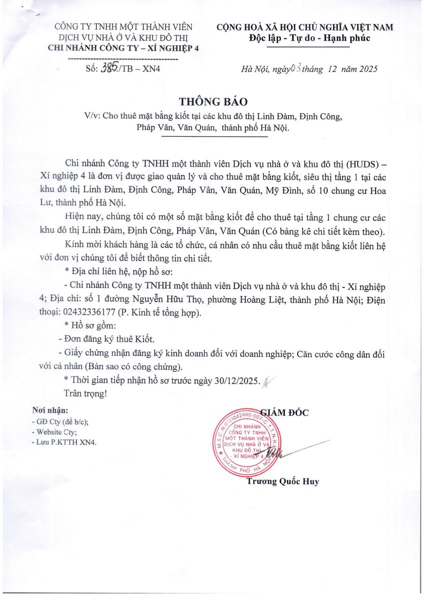 • Thông báo cho thuê mặt bằng kiốt tại Khu đô thị Pháp Vân - Tứ Hiệp
