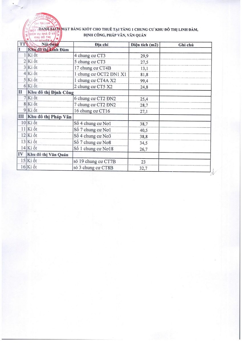 • Cho thuê mặt bằng kiốt tại các khu đô thị Linh Đàm, Định Công, Pháp Vân, Văn Quán thành phố Hà Nội