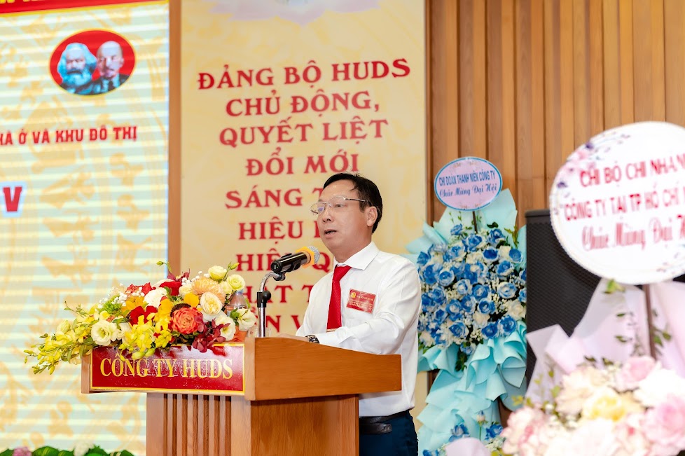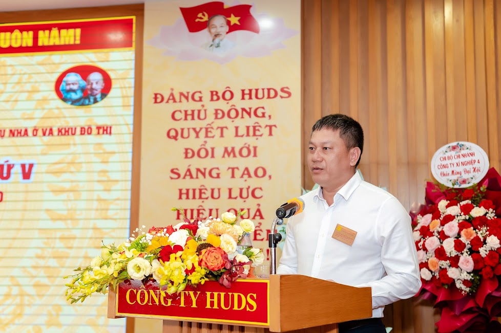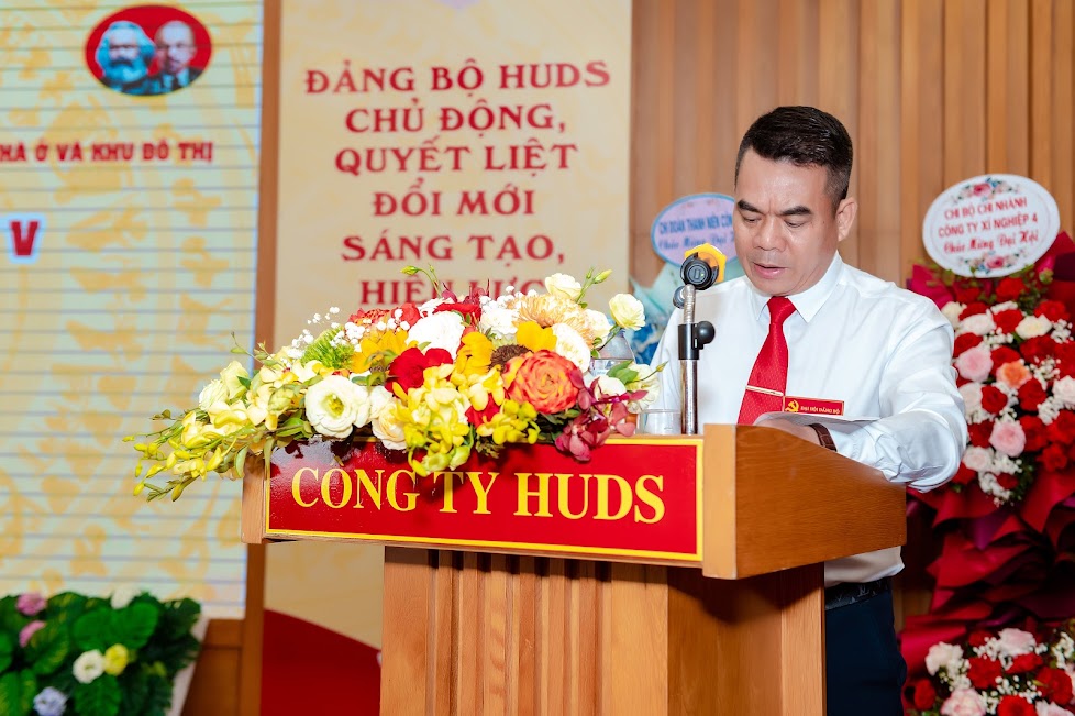 Đồng chí Thiều Hữu Hảo, Phó Bí thư ĐU, TV HĐTV, Giám đốc Công ty thay mặt Đoàn chủ tịch trình bày Báo cáo kiểm điểm của BCH Đảng bộ Công ty HUDS nhiệm kỳ 2020-2025.